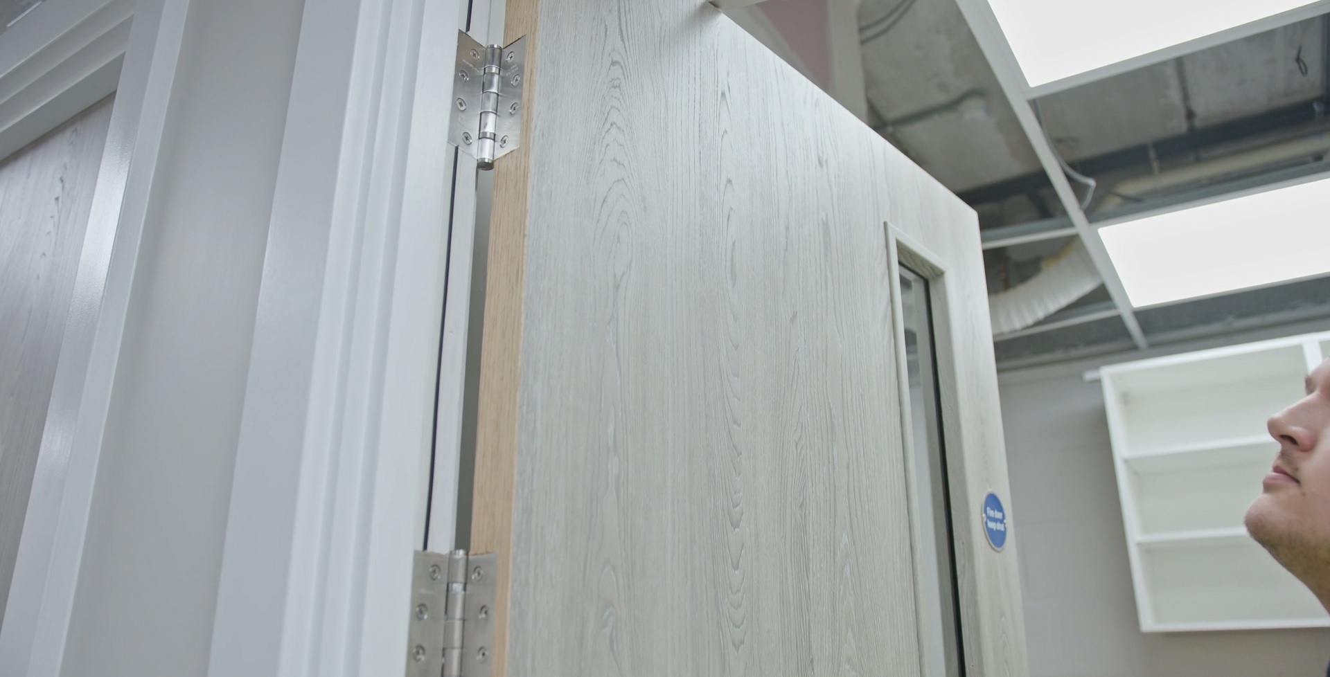 The door will be inspected on both faces, allowing to be opened and closed. In this stage the inspector is reviewing the door condition, looking for damages, markings, evidence of planing to the leaf or repairs. The inspector also reviews the head and hinge edge of the door for the signs of the manufacturer markings for documentation later.